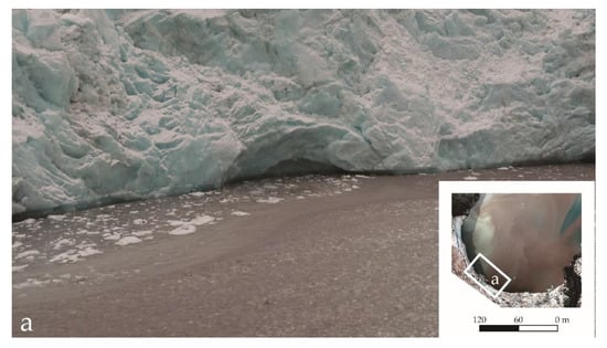 Sediment discharge in glacier meltwater is caused by two distinct mechanisms [9,10]. The first mechanism is triggered by subglacial water pressure creating cracks in bedrock that allow residue transport through upper ice levels, and the second mechanism is caused by the abrasion of bedrock by the rocks suspended in the basal ice layer. This sediment is transported with meltwater as subglacial discharge to the inlet or fjords [11,12,13,14,15,16,17] (Figure 1). If enough sediment and meltwater is provided, suspended matter will surface and form high-turbidity plumes on the water surface [18] (Video S1).