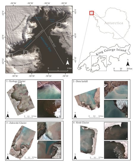 Satellite images (Landsat 8, acquired on 10 March 2018) showing the locations of the selected glaciers (white frames): 1—Ecology Glacier, 2—Dera Icefall, 3—Zalewski Glacier, 4—Krak Glacier. Black frames labelled a and b mark the positions of subglacial discharges and surface runoffs to particular glacier-front coves (images produced by a Zenmuse X5 camera from the Inspire 2 quadcopter drone).