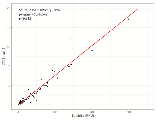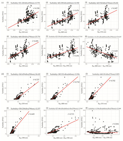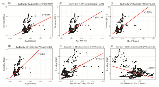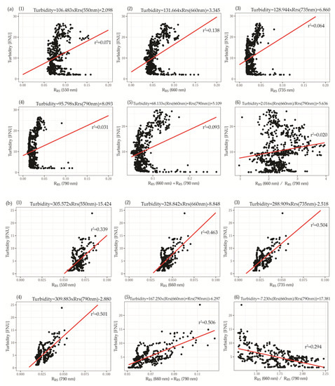 Previous works have shown that the turbidity and spectral response can be linear, log-linear, exponential, or logarithmic. Lower SSCs cause a linear increase in the turbidity. If the amount of particle matter increases, a non-linear increase in the turbidity is observed [53]. The sensitivity of a single band is decreased with increasing turbidity and becomes less linear [32].