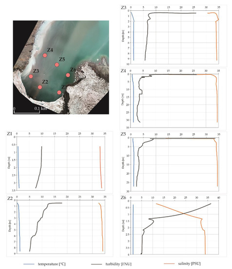 Figure 4 shows the vertical distributions of water temperature, turbidity, and salinity in front of the Zalewski Glacier on 15 February, 2019. All parameters show significant variation in the surface layer, which has a depth of about 1.5–3.0 m. Similar results were obtained by Dera [44]. This demonstrates the impact of meltwater from the glacier and indicates the boundary layer between salt and fresh water.