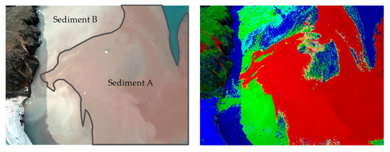 Zenmuse X5 photographs were used as the basis for orthophotomaps of the respective test fields. By using images in a natural colour model, it was possible to outline the shapes of the surface plumes, and through the percent clip histogram method [49], which sharpens particular colour tones, it was possible to identify the prevalent sediment colour. To retrieve the predominant sediment colour, the maximum RGB algorithm [50] was applied. To match the maximal/minimal intensity of the channel for every pixel, RGB values were used. Initially, the maximum of the R, G, and B values (m = max(r,g,b)) was determined. If R < m, then R = 0. If G < m, then G = 0. If B < m, then B = 0. This algorithm allows us to indicate the most contributing channel in a given area of an image. As a result, it was possible to separate homogenous sediment types and determine the shapes of the plumes. In all five analysed cases, two types of sediments (Figure 6) were distinguished. Sediment A was observed within each cove and contains one predominant channel: red. Sediment B was seen near only the Zalewski Glacier and, unlike the previous type, it includes two components: mostly green and less blue.
