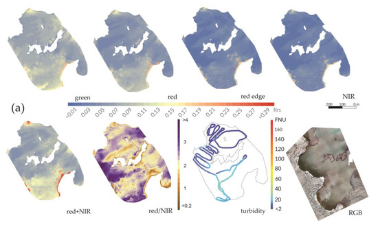 It should be noted, however, that this method has its limitations. First, it is applicable for only small bodies of water. The georeferencing of particular images cannot be performed for uniform water areas if each photograph does not involve software to combine consecutive shots [58], which can lead to artefacts and generate errors in the X,Y surface (Table 3). Multispectral images of shallow water areas can also be affected by additional reflectance from the water bottom, which may strengthen the signal [54], especially in shorter wavelengths (i.e., the green spectral band). The identification of glacial discharge can be affected through a number of phenomena: ice packs affect the imagery and release sediment particles into the water during melting and glacial calving, which, in cases of shallow fjords, can cause resuspension sediment particles from the sea floor [63]. Errors can also be introduced through water movement and plume rearrangement within the time between the flyover and the in situ measurements. Errors can also be produced by data aggregation, both in the overlapping of images from Parrot Sequoia+ (14-cm pixel resolution) and Zenmuse X5 (2-cm pixel resolution) and in joining the in situ measurement data.