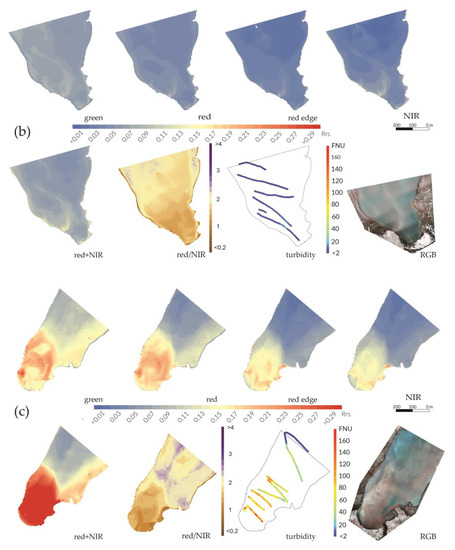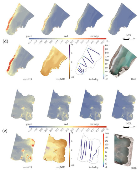 Reflectance in the red spectral band is most effective for lower turbidity (<70 FNU) and is less susceptible to values greater than 140 FNU. Nonetheless, the shapes of the plumes visible in this band most closely imitate the outflows depicted by the Zenmuse X5 camera (Figure 7c). In the RE and NIR spectral regions, high-turbidity waters are most effectively visualized with a value larger than 60 FNU, but these ranges are not responsive to low-turbidity waters. Increased turbidity, which was caused by water discharge at the glacier front [52], is visible in the red spectral band (Figure 7b). In occurrences of high-turbidity water outflows, the distinction can also be made with longer wavelengths rather than visible spectral bands (Figure 7d).