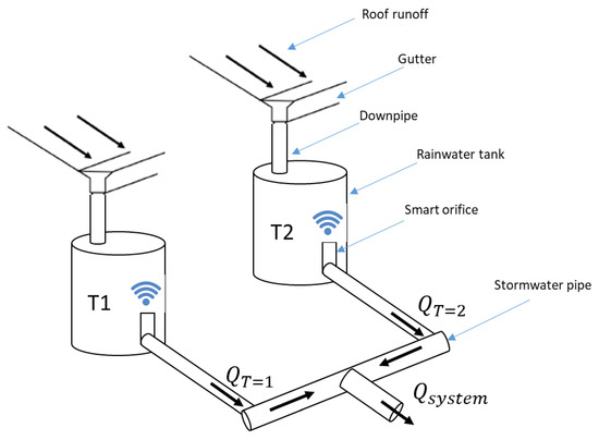 By controlling a number of smart rainwater tanks as systems during storm events, the timing of the peak flows from the sub-catchments contributing to each tank can be shifted, which will lead to a reduction in the peak discharge rate of the system as a whole. In order to illustrate this concept, a typical two-storage smart rainwater tank system is used (Figure 1). In this system, each tank is fed from roof runoff via a system of gutters and downpipes and the outflow from the tanks feeds into a drainage system (simplified as a freely draining stormwater pipe in the schematic in Figure 1). Both tanks are emptied prior to the arrival of a storm and the outflow from each tank is controlled independently throughout the storm event via remote-controlled, actuated orifices so as to minimize the total system outflow based on information on the temporal distribution of the incoming rainfall.