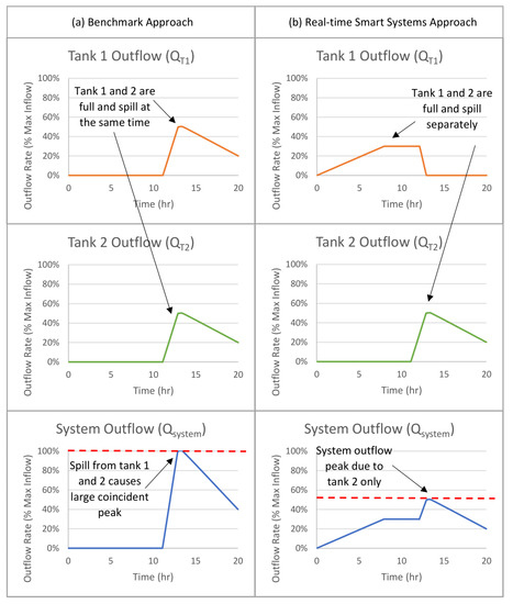 A conceptual representation of how the use of the real-time, smart systems approach is able to reduce peak flows is given in Figure 2. In this figure, the behavior of the real-time smart systems approach is compared with that of a benchmark approach, as part of which the tanks are drained prior to the arrival of the storm, as is the case with the real-time, smart systems approach, but where the orifices remain closed during the rainfall event so that the tanks behave as retention tanks during the storm. As can be seen, when the benchmark approach is used (Figure 2a), both tanks are starting to fill from the beginning of the storm. Once the tanks are full, but rainfall continues, both tanks overflow, and the system operates as though there is no storage from that point onwards. As a result, the peak flows from the two sub-catchments are coincident, resulting in a relatively large outflow from the system as whole.