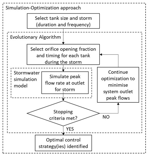 In order to solve the optimization problem outlined in Section 2.2, a simulation-optimization approach is used [30,31] (Figure 3). An evolutionary algorithm [30] is used to select values of the decision variables (i.e., the combination of the degree of opening of the orifices of each tank at each time step) (see Section 2.2). A stormwater simulation model is then used to evaluate the peak flow rate at the system outlet for the selected values of decision variables. Based on the relative success of the selected decision variable values in reducing system peak flow rates, these values will be adjusted using the operators of the evolutionary algorithm (i.e., selection, cross-over, and mutation) so as to further reduce peak flows. This process of selecting a particular control strategy with the aid of the evolutionary algorithm, evaluating the effectiveness of this strategy using a simulation model, adjusting the control strategy based on the relative success of the previous strategies using the evolutionary algorithm, etc. is repeated hundreds or thousands of times until certain stopping criteria have been met, such as completing a fixed number of iterations or until there has been no reduction in peak flows for a certain number of iterations [31].
