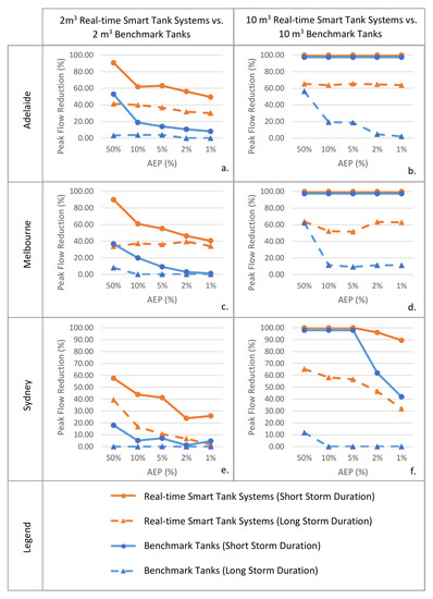Figure 4. Performance of real-time, smart tank systems versus benchmark tanks for the three locations (Adelaide, Melbourne, and Sydney), two tank sizes (2 × 2 m3 and 2 × 10 m3), and five AEPs (50%, 10%, 5%, 2%, and 1%) considered. For the sake of clarity, only results for the shortest (30 min) and longest (24 h) durations considered are shown, with results for the full set of durations considered shown in Figure 5 and Appendix A. (A full dataset of peak flow reduction is available in Supplementary Materials File S1). The figure shows the performance of 2 m3 real-time smart tank systems versus benchmark tanks for (a) Adelaide, (c) Melbourne (e). Sydney and 10 m3 real-time smart tank systems versus benchmark tanks for (b). Adelaide, (d). Melbourne (f) Sydney.