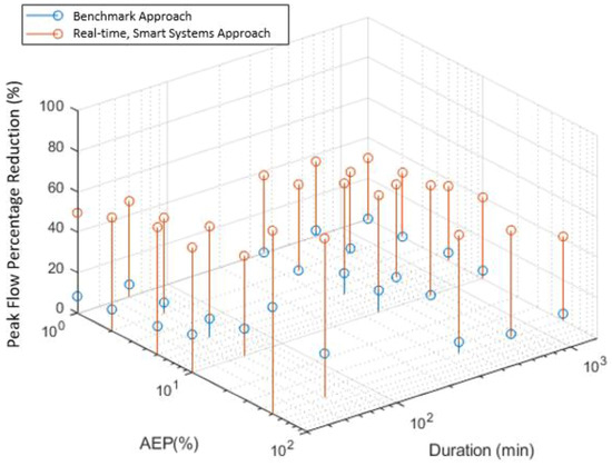However, as discussed in Section 4.1, real-time smart systems do not perform markedly better than benchmark tanks when the tank to runoff volume is less than 0.15, as there is insufficient storage to offset peak flows. An example of this is shown in Figure 8 for a long duration (24 h) event with an AEP of 1% for Sydney, for which the storage to runoff volume is 0.034. The reason the real-time smart systems approach achieves less than 5% reduction in this instance is due to a combination of the higher rainfall intensity and the temporal pattern, producing an inflow rate that fills both tanks within the control update time step of 1 h (see Table 2).