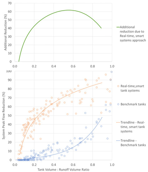 Figure 6. Relationship between the ratio of tank to runoff volume and peak flow reduction for all computational experiments (i.e., for all locations, AEPs, rainfall durations, and tank sizes considered) for benchmark tanks (blue circles and dashed line) and real-time smart tank systems (orange circles and dashed line). The green solid line represents the additional peak flow reduction that can be achieved by using real-time smart tank systems control based on the difference between the two trendlines fitted to the data sets. The trendlines were developed by trial and error and visual inspection for data where x < 0.9 (Trendline—Real-time, smart tank systems: y = 2 × ln(x) + 90 (r2 = 0.7953) and Trendline—Benchmark tanks: y = 70 x4 − 20 x3 + 10 x2 + 10 x (r2 = 0.8327). Results for tank to runoff volume ratios in excess of 1 are not shown, as they all result in peak flow reductions of 100%.