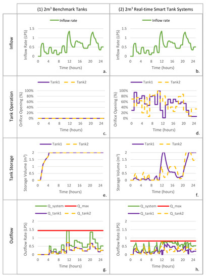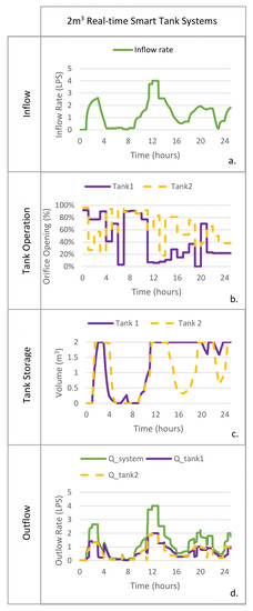 During the period t = 4–11 h, the orifices of both tanks remain open (Figure 8b) to ensure the tank is empty prior to the arrival of the main peak of the inflow (Figure 8a). However, the much higher inflow rate that starts around t = 12 h of greater than 3–4 LPS (liter per second) means the 2 m3 tanks become full in the t = 11–12 h period (Figure 8c). An inflow rate of 3 LPS produces an inflow volume of 3.6 m3 in 1 h. This is close to the capacity of the 2 × 2 m3 tank. As the capacity of the tanks is exceeded in a 1 h period, there is limited opportunity to delay the peak using either of the tanks. Hence, the peak of the outflow is similar to the peak of the inflow. A larger storage size is able to solve this problem, so that the volume produced by a high inflow rate during a control update time step can be contained in one of the tanks.
