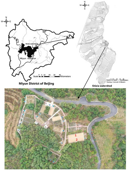 The Shixia watershed is located in the northeast of the upper reaches of Miyun reservoir in Beijing, within the primary protection zone of the Miyun reservoir, between 117°01′–117°07′ E and 47°32′–47°38′ N, with a total watershed area of 33 km2, as shown in Figure 1. The small Shixia watershed is also located in the Yanshan mountain range, in the transition zone from the piedmont alluvial plain to the mountainous region. It is an earth-rock shallow hilly area with high terrain in the north and low terrain in the south, whose altitude is 150–390 m. The gully density is 0.2 km km−2, and the slopes are gentle with a slope grade larger than 20° only accounting for 16.2% of the watershed area. The lithology is dominated by gneiss, among which are scattered granite and limestone. The soil type is brown soil developed on alluvial and diluvial parent materials with light soil texture, deep soil layer, compact soil mass, and shallow tillage layer. The basin has a warm temperate monsoon climate. It is dry and cold in winter with an average temperature in January of −6.6 °C and is hot in summer with an average temperature in July of 25.3 °C. The annual evaporation of the whole basin is 1840 mm, and the annual average rainfall is 661.8 mm. Eighty percent of the precipitation occurs from June to September. The vegetation in the northern part of the basin is dominated by weeds and shrubs. The vegetation in the hilly area is mostly artificial Robinia pseudoacacia, Pinus tabulaeformis, and economic forest. Human activities have been frequent for a long time, and natural vegetation types, having been destroyed, are hard to see.