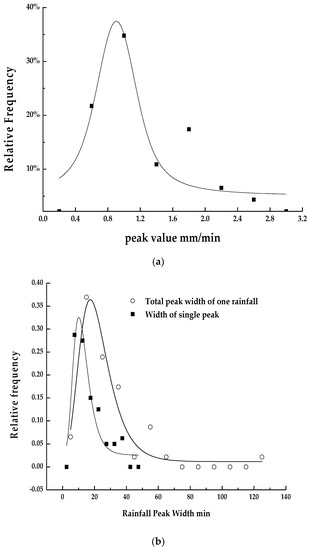 Figure 2 shows the frequency distribution of the rainfall peak value and peak width. The frequency distribution of the rainfall peak value in this region was in accordance with the Voiht peak shape function, and the peak value of rainfall was from 0.4 to 3.2 mm min−1, of which 0.8–1.2 mm min−1 was most common, accounting for 33%. The frequency distribution of the rainfall peak width was in accordance with the extreme distribution. The peak width of rainfall was generally less than 60 min, of which 10–20 min was most common, accounting for 38%. The frequency distribution of a single rain peak width conformed to the extreme peak function. The duration of a single rain peak was generally below 40 min, and the majority were about 5–10 min, which accounted for 29%, followed by 10–15 min, which accounted for 28%.