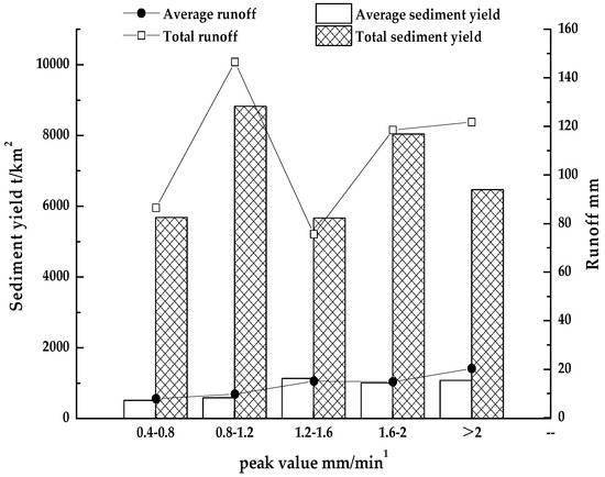 Figure 3 shows the variation in runoff and sediment yield with the peak value. With an increase in the peak value, the average runoff and sediment yield increased gradually. The average runoff and sediment yield with a peak value >2 mm min−1 were 2.58 times and 2.09 times higher than those with a peak value in the range of 0.4–0.8 mm min−1, respectively. Rainfall with a peak value from 0.8 to 1.2 mm min−1 produced the largest amount of runoff, which was up to 146.50 mm, accounting for 27% of runoff generated by all rainfalls. Although the average runoff of one rainfall within this peak range was the smallest, the number of rainfalls was the highest (15, see Figure 2), thus contributing greatly to the total runoff. Rainfalls with a peak value of 0.8–1.2 mm min−1 also produced the largest amount of sediment, which was up to 8825.33 t km−2, accounting for 25% of the sediment generated by all rainfalls because of the high number of rainfalls.
