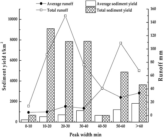 Figure 4 shows the runoff and sediment yield characteristics of rainfalls with different peak widths. With an increase in the peak width of the rainfall, the average runoff and the average sediment yield showed an increasing trend. Compared with rainfalls with a peak width <10 min, the runoff yield and sediment yield formed by rainfalls with a peak width >60 min increased by 7.16 times and 8.05 times, respectively. Rainfall with a peak width of 20–30 min produced the largest amount of runoff, which was up to 149.79 mm, accounting for 27% of runoff generated by all rainfalls. Rainfall with a peak width of 20–30 min not only produced high average runoff (13.62 mm) but also had high rainfall times (11, see Figure 2), thus contributing greatly to the total runoff. Rainfalls with a peak width of 10–20 min produced the largest amount of sediment, which was up to 9099.07 t km−2, accounting for 26% of the sediment generated by all rainfalls. This was mainly due to the largest number of rainfalls within 10–20 min (17, see Figure 2), accounting for 38% of the total rainfalls.