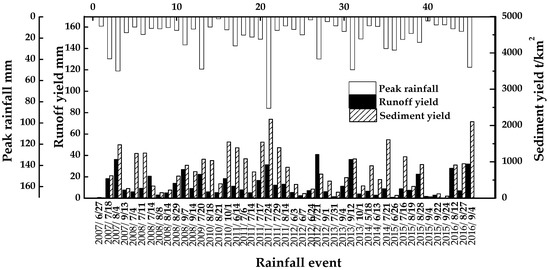 During the 10 years from 2007 to 2016, there were 101 erosive rainfalls in the small Shixia watershed. In order to analyze the impact of rainfall on runoff and sediment yield, we had to eliminate the previous rainfall events as much as possible, so 45 precipitation events without rainfall in the previous two days were selected. The total rainfall of these 45 rainfall events was 1494.4 mm with an average rainfall of 33.2 mm, a maximum rainfall of 114.3 mm and a minimum rainfall of 9.8 mm. The average rainfall duration was 391.0 min, with a maximum rainfall duration of 1225.0 min, and a minimum rainfall duration of 20.0 min.