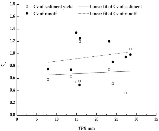 Change in the Cv of the annual runoff and sediment yield with the total peak rainfall amount of one rainfall (TPR).