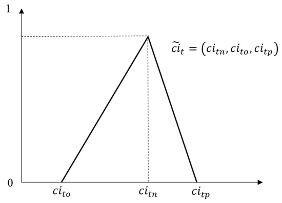 If triangular fuzzy numbers are considered in the form , where rj, cj, and Rj correspond to the left (optimistic), center, and right (pessimistic) values, the membership function is given in the following way: