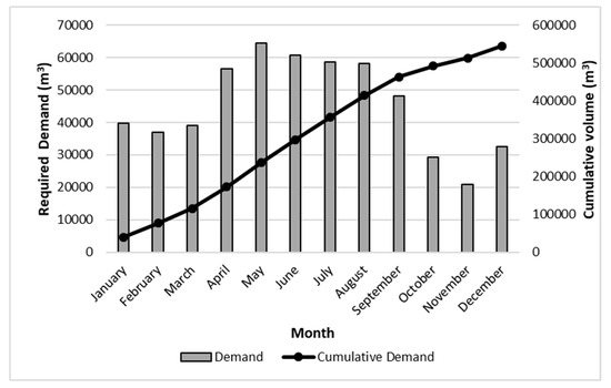 The data used in this model were the same as those used by [39] to make a comparison between both mathematical programming methods applied on the same water system. However, in this case, the total costs were determined considering the cumulative storage cost to make possible the comparison among the different proposed methods. Figure 3 shows the water demand of the case study for each month, as well as the annual cumulative required water. This water demand was satisfied from different water sources. Source 1 came from water transfer of another basin, and its price was fixed over time. The water of Source 2 was obtained from wastewater treatment, and its price was also fixed over time. Finally, the water from Source 3 came from desalination. The prices of Sources 4 and 5 were variable since they came from wells, and therefore; their prices depended on the energy price.