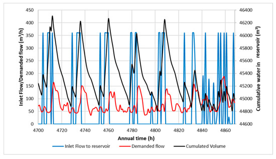 Regarding the operation of the irrigation system, Figure 4 shows the third week of June, for which the cumulative volume in the reservoir (i.e., storage) oscillated between 46,308 and 44,815 m3. This trend was stable over the planning horizon once the water system reached continuous time. Therefore, the planning demonstrated that it was not necessary to reach the maximum water level in the reservoir in the winter season since the water sources were enough to meet the annual water demand, minimizing the exploitation costs. Accordingly, the proposed model showed a significant improvement in comparison with the results given by the water manager, enhancing the current management [26]. In this sense, the proposed model allowed distributing the energy, storage, and management costs over the planning horizon simultaneously with incomes provided from selling water to farmers. Otherwise, the current planning method used by water manager concentrates most of the amounts of required water in winter months, and consequently, it is necessary to have large flows of cash available or, in some cases, to apply for loans from credit institutions.