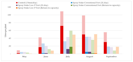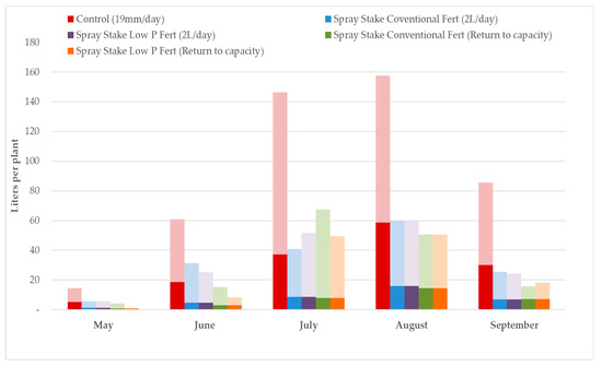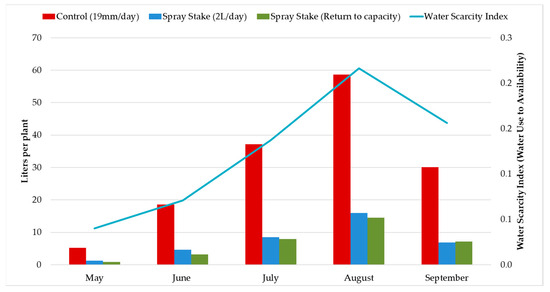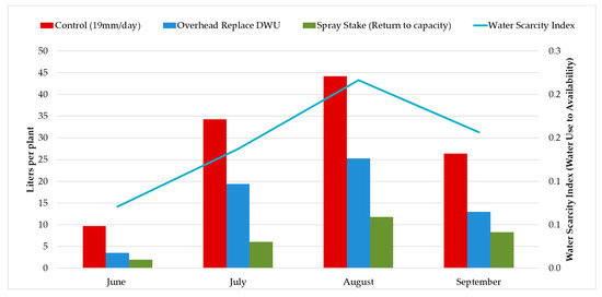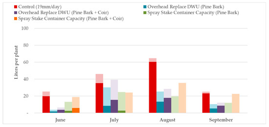 In 2017, the monthly WSFiwa for plants receiving 2 L per day through spray stakes and plants that were returned to container capacity daily were similar but ranged from 16% to 25% of the monthly WSFiwa for control plants receiving 19 mm per day through overhead irrigation (Figure 1).