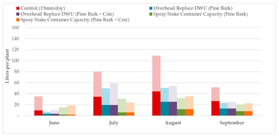 Three irrigation regimens were used in the 2017 study (17 May to 22 September)—a control of 19 mm applied daily via overhead irrigation, spray stakes applying 2 L per container daily, and spray stakes applying water on the basis of substrate moisture content (0–2.4 L per container per day) in order to return to container capacity. Container capacity refers to the percentage of water in a substrate after free drainage has occurred [34]. Container capacity for pine bark-based substrates have typically been reported between 45% and 65% by volume [35]. Irrigating on the basis of substrate moisture content is a management practice that may allow for improved water use efficiency through applying water on an as-needed basis determined by measured volumetric water content in substrates and precluding over irrigation [21,24,26].