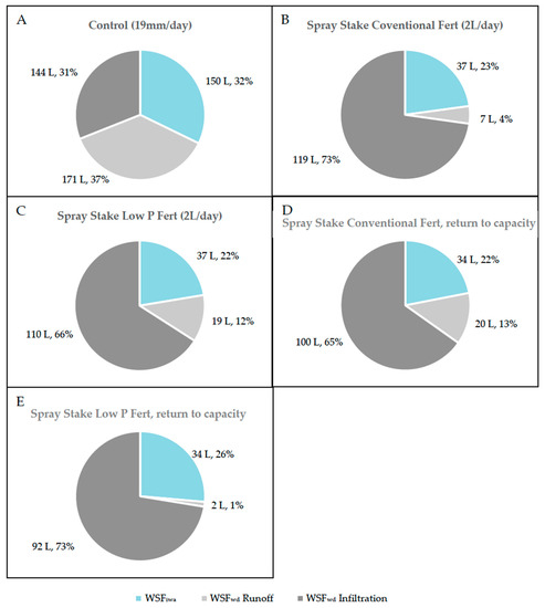 Another perspective can be seen when comparing the relative impact of WSFiwa, WSFwd from runoff, and WSFwd from infiltration for treatments for the entirety of each experiment (Figure 7 and Figure 8). Although WSF for the control plants was 2.8 to 3.6 times greater than the other treatments in 2017, WSFiwa contributed 32% of the combined WSF, whereas WSFwd from infiltration and runoff were equal and totaled 68% of WSF (Figure 7). WSFwd from infiltration was 65% to 73% of the WSF for the other treatments. WSFwd from runoff was much less important for these treatments. For the low-P fertilizer treatment, WSFwd from runoff was only 1% of WSF compared to 12% for the conventional fertilizer. In 2018, the WSF was generally smaller than in 2017, but the combined WSF of plants in the control treatment were still 1.9 to 2.8 times greater than for plants from the other treatments (Figure 8). In this experiment, WSFwd from runoff constituted 50% of the combined WSFwd in the control plants, whereas WSFwd from infiltration contributed only 8%. The WSFiwa for plants receiving daily replacement of DWU was 2.3 times greater than for plants returned to container capacity daily. WSFwd from runoff averaged 5% and 6% of the WSF for plants returned daily to container capacity with spray stakes for the pine bark and pine bark + coir, respectively. However, that is much less than for plants in pine bark (29%) and pine bark + coir (31%) and receiving replacement of DWU from overhead sprinklers. The most striking difference between those sets of treatments was the higher percentage of the combined WSF from WSFwd due to infiltration in the plants returned to container capacity with spray stakes (66%) compared to plants receiving DWU replacement daily from overhead sprinklers (31%).