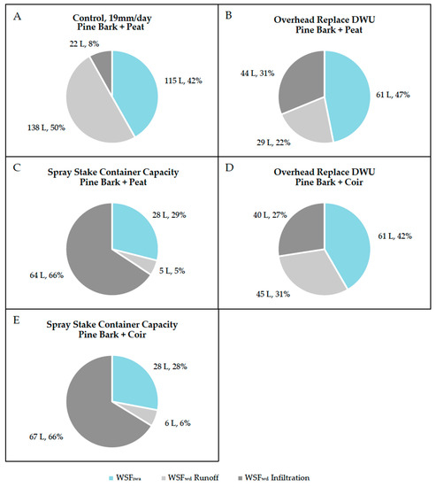 Runoff contributed the vast majority of monthly WSFwd for the control treatment in 2018 (Figure 4). Infiltration water was the primary contributor to WSFwd for the treatment supplying enough irrigation to replenish container capacity, but runoff had a greater impact (22% to 28%) on monthly WSFwd for the irrigation treatment that replaced DWU through overhead sprinklers. Substrate composition had a limited and inconsistent impact on WSFwd.