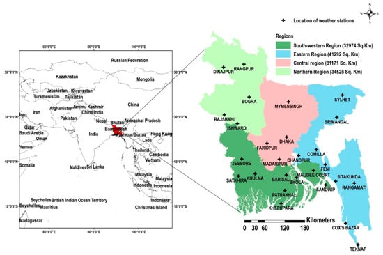 Drought is the most complex of chronic natural calamities that is characterized by the lack of precipitation over an extended period of below-normal precipitation and can cause substantial economic loss as well as human suffering []. According to Wilhite and Glantz [], droughts are classified as meteorological, agricultural, hydrological, and socio-economical droughts. Meteorological drought occurs when the rainfall deficit for a stated period (day, month, season, or year) exceeds a certain threshold, usually defined as a proportion of the long-term average (minimum 30 years). Meteorological drought is typically an expression of precipitation’s departure from normal over a specific period. The hydrological drought refers to deficiencies in surface and subsurface water supplies based on measurements of streamflow and lake, reservoir and groundwater levels, while the agricultural drought occurs when there is not enough soil moisture to meet the needs of a particular crop in a specific time by the deficiency of precipitation for an extended period. Agriculture is generally the first economic sector to be affected by drought. It happens after a meteorological drought but before the hydrological drought. Agricultural drought consequences from the impact of meteorological or hydrological droughts on crop yields []. Socioeconomic drought occurs when physical water shortage starts to affect people, individually and collectively. At present, drought is regarded as one of the most frequent natural disasters in Bangladesh [], given its adverse impact on agricultural production and the environment. Moreover, the frequency and intensity of droughts have been continuously increasing in recent years, which have had a significant effect on agricultural production [].