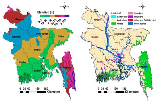 The study area covers Bangladesh, which is situated in the latitudes between 20°34′ and 26°38′ N and longitudes between 88°01′ and 92°41′ E in South Asia. India bounds Bangladesh along the west, north, and northeast borders; it borders Myanmar in the south-east. The Bay of Bengal demarcates the southern border with a long coastline (Figure 1). Although the elevation in the northern part of the country can go up to 105 m above sea level, most of the area in Bangladesh is less than 10 m above sea level. The predominance of agriculture land is evident, given that 3/4th of the total geographical area is under cultivation, followed by forest cover, including orchards, as shown in Figure 2.