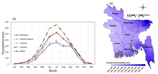 (a) Monthly distribution of rainfall four different regions of Bangladesh and. (b) Spatial distribution of rainfall from 1980 to 2015.