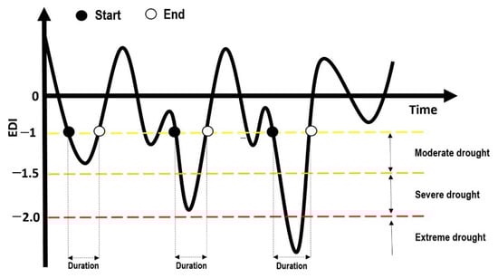 The schematic illustration of drought characteristics (duration, severity) with EDI time series. (Adopted from Kamruzzaman et al. []).