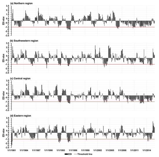 The drought over Bangladesh was analysed using the EDI method by using monthly rainfall time-series data (1981–2015). Average rainfall data from the stations in the individual sub-regions were used for calculating EDI. According to Dash et al. [], the regional average rainfall data of neighbouring stations provide better information for drought diagnose when compared to the individual station analysis. Moreover, given that drought is a regional phenomenon, detecting historically recorded drought events using monthly rainfall time-series data from the stations is a challenging task.