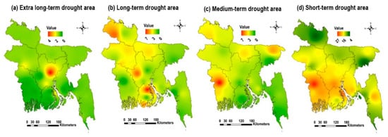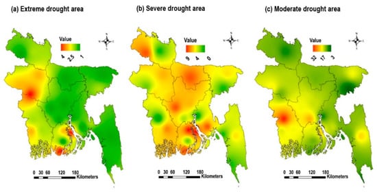 The western part of north Bangladesh and a small portion along the coastal area in the southwest region were extreme drought-prone regions, as shown in Figure 6a. The severe drought-prone regions were found in the northern, southwest and central areas (Figure 6b). Further, the spatial pattern suggests that most of Bangladesh is moderately drought-prone and a higher drought frequency was observed in the south-western regions (Figure 6c). The spatial analysis of the occurrence of droughts (different categories) indicates that the northern, south-eastern, and central regions of the country are comparatively more vulnerable to drought. Extreme droughts were observed most frequently in the western part of the country. However, the eastern part of the country was observed to be less vulnerable to droughts.