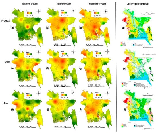 Spatial distribution of seasonal drought in Bangladesh during 1981–2015: Upper row indicates the results for Pre-Kharif season with (a) Extreme; (b) Severe; (c) Moderate Severities, and (d) Observed distribution, middle row shows the results for Kharif season with (e) Extreme; (f) Severe; and (g) Moderate Severities and (h) Observed distribution and bottom row is for the Rabi season with (i) Extreme; (j) Severe; (k) Moderate severities; and (l) Observed distribution. The observed agricultural drought maps (right column) were developed by BARC in 2000 (Source of the observed map: http://maps.barcapps.gov.bd/index.php).