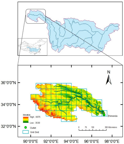 The SRYR is located in the hinterland of the Qinghai-Tibet plateau, which refers to the area above the Zhimenda runoff station (Figure 1). The region has an average elevation of over 4500 m amsl (90°33′–95°20′ E, 32°26′–35°46′ N), and the area is approximately 13.77 × 104 km2. More than 200 small tributaries contribute to the runoff in the source region and discharge from Zhimenda runoff station into the downstream basin. Based on the Köppen Geiger climate classification system [20], the SRYR is characterized by a monsoon-influenced subarctic climate (Dwc), which means dry winters and cool summers.