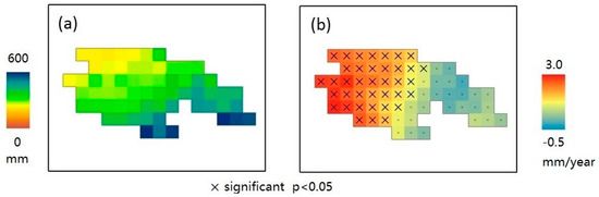 Located on the Tibet Plateau, the SRYR precipitation showed high topographical dependence. The mean annual precipitation varied markedly over the basin. In general, there was larger precipitation in the southeastern areas that decreased toward the northwestern high elevation areas (from 632.6 to 234.6 mm; Figure 3a). This distribution stemmed from the southeasterly monsoon that weakened as it approached the inland. There was a significantly (p < 0.05) increasing trend in annual precipitation (warming) across the western part (Figure 3b). This trend equaled about 2.3 mm/year for the significant area of the basin.