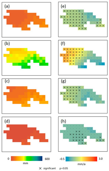 Trend analysis of seasonal mean precipitation showed both increasing and decreasing tendencies, but only increasing trend was statistically significant (p < 0.05). The significantly (p < 0.05) increasing trend in spring (Figure 4e) ranged from 0.3 to 0.7 mm per year and occurred over the western parts and in the eastern corner. During summer (Figure 4f), a statistically significant increasing trend (p < 0.05) only occurred over the western part, in the range of 0.8 to 1.9 mm per year. Autumn (Figure 4g) mean precipitation also showed a significant increase over the western part but with a smaller area than in summer. The general range of significantly increasing trend in autumn precipitation was between 0.3 and 0.7 mm per year. For winter (Figure 4h), mean precipitation displayed a significantly increasing trend (range 0.1 to 0.8 mm per year) over the central area and a small area in the southeast.