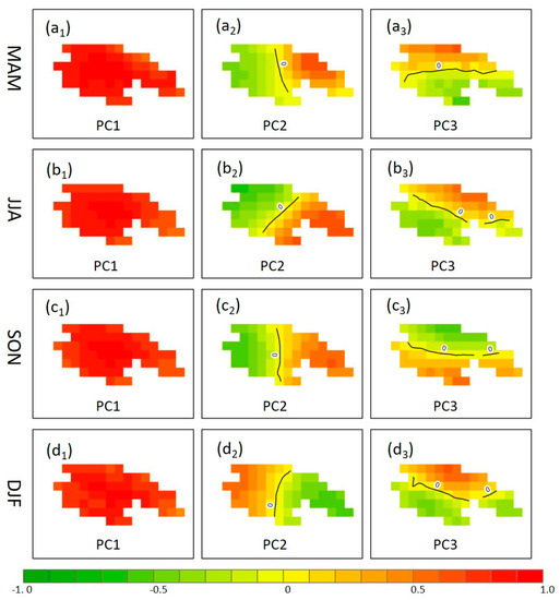 Spatial patterns for the leading three PCs of seasonal precipitation anomaly. (a1–a3) PCs of Spring (MAM), (b1–b3) PCs of Summer (JJA), (c1–c3) PCs of Autumn (SON), (d1–d3) PCs of Winter (DJF).