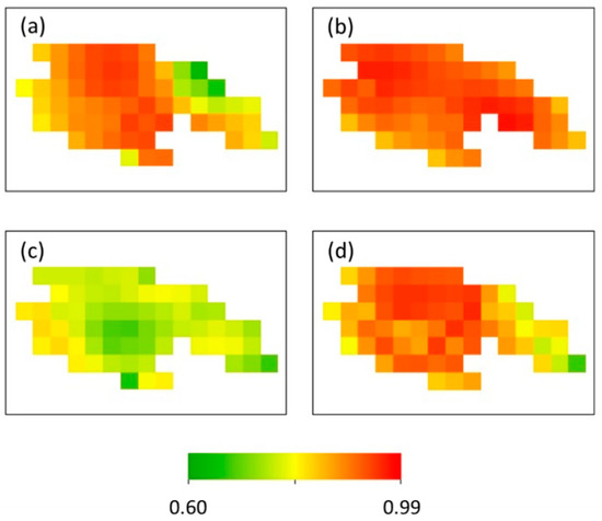 To validate the performance of the models with regard to spatial distribution, simulated precipitation was derived by reconstruction using simulated PCs in Table 4. Pearson correlation coefficients between the target dataset (seasonal precipitation anomalies) and simulated datasets are shown in Figure 6. Correlation coefficients for all seasons (Figure 6a–d) showed significant results over the whole basin (p < 0.05), with a mean coefficient of 0.872 for spring, 0.922 for summer, 0.762 for autumn, and 0.881 for winter. This shows the overall capability of capturing the spatial distribution of precipitation using PCA-ANN models. With these results, the ranking of PCA-ANN model performance was summer>winter>spring>autumn. The results in summer provided powerful support that the PCA-ANN model is capable of application in SRYR, as summer is the rainy season with 80% of the annual precipitation. In winter and spring, as less precipitation occurred during this season, the precipitation pattern was less complicated compared to other seasons, by which the model was able to capture the variability efficiently. In autumn, the models showed less good performance, possibly because of the complex conditions of atmospheric circulation during this season. Autumn was characterized by a transformation of the atmospheric circulation between southeasterly winds (summer) to northwesterly winds (winter). In any case, we can conclude that the PCA-ANN model is capable of predicting precipitation in the SRYR with good results. The ability to predict seasonal precipitation using climate indices provides an alternative and improved way of accessing the precipitation regime in SRYR. Thus, the PCA-ANN model provides a significant tool that can contribute to better water resource management in this area.