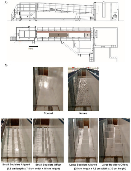 (A) Scheme of the experimental flume, representing a side view of the channel on a slope of 3% (above), and a top view (below) with the location of (1) the experimental low-head ramped weir (ramp 3.00 m long on a slope of 10%, with a 0.20 m weir crest, located 2.50 m upstream the acclimation area), (2) the approach area (the 0.30 m2 shaded area immediately downstream of the ramp toe), and (3) the acclimation area (the 0.60 m2 shaded area between the two removable fine mesh panels located downstream); (B) Images of the six configurations tested, contemplating the Control ramp (without substrates) and the retrofitted designs selected: Nature (ramp with cobbles randomly distributed), Small Boulders Aligned and Offset (boulder dimensions 7.5 cm long × 7.5 cm wide × 15 cm high), and Large Boulders Aligned and Offset (boulder dimensions 25 cm long × 7.5 cm wide × 30 cm high).