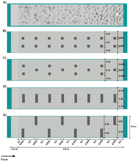Scheme of the substrates arrangement for the retrofitted designs (RD), showing flow direction and the 0.2 m weir crest: (A) Nature (the mapping of cobbles along the ramp was done using a Kinect Sensor); (B) Small Boulders Aligned; (C) Small Boulders Offset; (D) Large Boulders Aligned; (E) Large Boulders Offset. Substrates dimensions: Cobbles—10 to 30 cm; Small Boulders—7.5 cm long × 7.5 cm wide × 15 cm high; Large Boulders—25 cm long × 7.5 cm wide × 30 cm high.