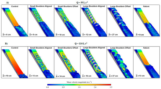 Regarding (Figure 4 and Figure 5), mean depths varied according to Q and the RD tested. Higher depths were registered, as expected, with Q = 110 L·s−1 (>4 cm, on average, except for the configuration Large Boulders Offset that registered a variation of 10 cm), and in the configurations with the larger boulders, especially in the Large Boulders Offset ( = 27 cm, for Q = 55 L·s−1, and 37 cm, for Q = 110 L·s−1). Shallower water depths were observed in the configurations Control ( = 6 cm, for Q = 55 L·s−1, and 10 cm, for Q = 110 L·s−1) and Nature ( = 9 cm, for Q = 55 L·s−1, and 13 cm, for Q = 110 L·s−1).