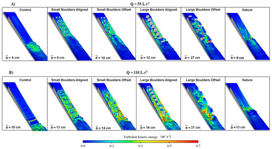Characterization of the turbulent kinetic energy per unit mass (; m2·s−2) for each configuration tested, using the computational fluid dynamics (CFD) commercial software FLOW-3D®, considering the discharges of: (A) 55 L·s−1, and (B) 110 L·s−1. Mean water depths over the ramp (; cm) is also presented for each configuration.