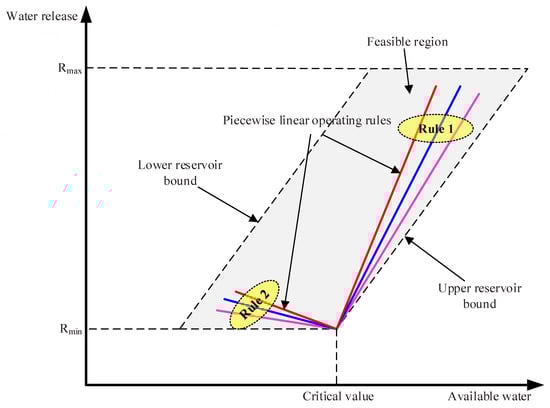 An intuitive description of linear operating rules is shown in Figure 2 [,]. The grey area is the feasible region for decision-making of reservoir water release, which is enclosed by the reservoir storage bounds and water release bounds. The three lines with different colors represent operating rules of different time periods, such as the first, second and third time period of 36 time periods in each year. In addition, when available water is less than the critical value, water release is determined by using the rule 2. While available water is greater than critical value, water is released according to the operating rule 1. Here, the form of rules 1 and 2 is determined by Equation (14) or Equation (15). That is to say, rules 1 and 2 are concrete implementations of rule A or rule B.