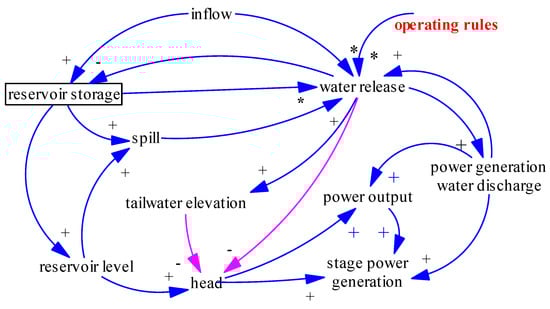 In Figure 4 and Figure 5, blue or purple lines with an arrow are causal chains or connecter and represent the cause relationship among variables. In Figure 4, the sign (+ or −) at the end of the lines indicate the type of effect one variable has on the other, positive feedback or negative feedback. For example, an increase in the independent variable, reservoir level, leads to an increase in the dependent variable, head. The sign * represents that water release is determined by reservoir storage, inflow and operating rules and the polarity of causal chain among them is uncertain due to the complexity of operating rules. Actually, the stock-flow diagram here is simplified. Detailed stock-flow diagram is shown in the case study. In addition, in Figure 4 and Figure 5, all variables have physical explanations and the model structure also satisfies the physical mechanism (water balance) strictly. Therefore, the verification of model parameters and structure can be simplified.