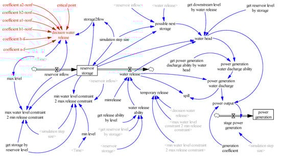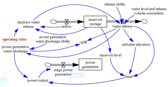 The dynamic characteristics of reservoirs are obvious. Reservoir storage changes with inflow and outflow. When net inflow is positive, reservoir storage increases, while when net inflow is negative, reservoir storage decreases. Based on the above dynamic characteristics, we develop the causal loop diagram (Figure 3) and the stock-flow diagram (Figure 4) for hydropower reservoirs using the Vensim Soft [], which is an object-oriented simulation environment based on the principle of SD and allows you to efficiently and simply simulate, analyze and optimize dynamic systems.