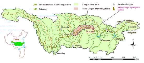 The TGR is the largest and the most crucial comprehensive reservoir, which lies in the upper reaches of the Yangtze River, the longest river of China (Figure 5). The average annual inflow at dam site is approximately equal to 4.51 × 1011 m3/year. The catchment area of the reservoir is about 106 km2. With a flood control capacity of 2.215 × 1010 m3 and a usable storage capacity of 1.65 × 1010 m3, the TGR plays an important role in flood control, hydropower generation, water supply and navigation. The hydropower station is equipped with 32 units of 7 × 105 kW and 2 units of 5 × 104 kW, with a total installed capacity of 2.25 × 107 kW.