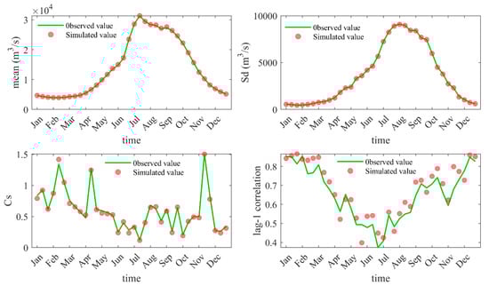 The parameters of the first-order SARM (Equation (3)) is calibrated based on the 130-year reservoir inflow records (from 1882 to 2011) from the Yichang hydrologic station (restricted to article space, the 108 model parameters of SARM are not listed in detail). Then, 10,000 years of synthetic inflow series is generated with a ten-day time step using the calibrated model (the 10,000 years of synthetic inflow sequence generated here is only used to verify the validity of the SARM model). The basic statistical parameters of the observed and simulated inflow data, including the mean value, standard deviation, skewness coefficient and lag-1 correlation coefficient, are calculated, as shown in Figure 6. It can be seen that the mean value, standard deviation, skewness and lag-1 correlation coefficient of the simulated data fit those of observed data well. Obviously, there is no significant difference between the main statistical parameters of the simulated sequence and the corresponding statistical parameters of the observed inflow sequence. Therefore, the first-order SARM passes the practical test and is applicable.