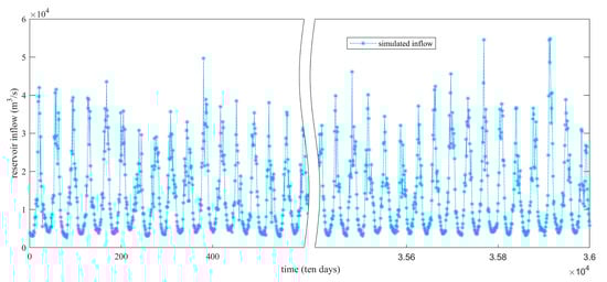 Generally, the historical inflow sequence is too short to extract the operating rules reliably. In order to generate a long-term reservoir inflow sequence that reflects both features of historical inflow and characteristic of possible future inflow, a hydrological simulation model needs to be built []. Obviously, due to the periodic revolution and rotation of the earth, the climate also shows periodic characteristics. That is to say, the ten-day (in this study, a year is divided into 36 periods) inflow of reservoir have periodic characteristics. Therefore, a first-order SARM is used to characterize the inflow time series of reservoir and to generate a large number of synthetic reservoir inflow scenarios in this study. And the pre-processing of the historical inflow series and the structure of first-order SARM are introduced in this section.