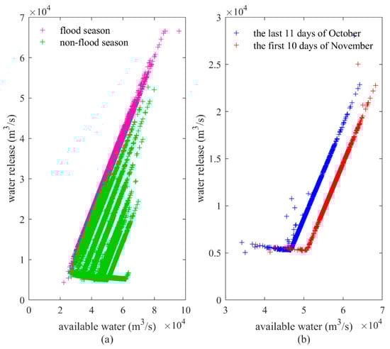 Scatter plots of optimal water release versus available water (). (a) The purple plus signs and green plus signs denote the correlation between optimal water release and available water during flood season and non-flood season, respectively. (b) The blue plus signs denote this correlation during the last 11 days of October and the red plus signs denote this correlation during the first 10 days of November.